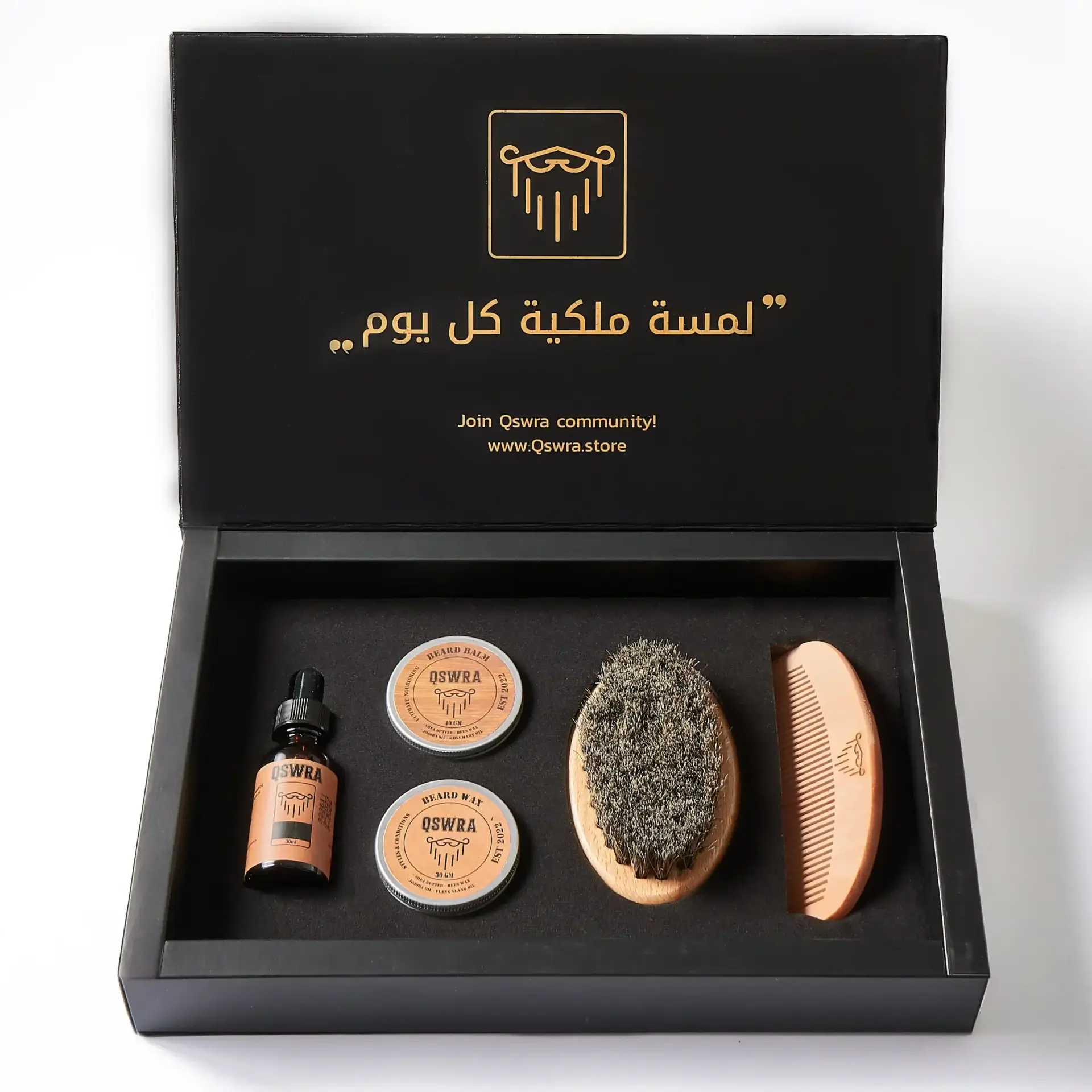 QSWRA Beard Box is the ultimate grooming kit for men who want to maintain a well-groomed and stylish beard. This comprehensive set includes a premium beard oil, balm, wax, wooden comb, and a natural bristle beard brush. Designed for both functionality and luxury, it’s perfect for daily beard care, ensuring softness, shine, and style.